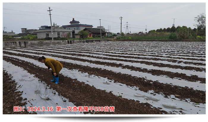 回想年前說要召開苗期會議的時候,大家都有點不知所措,因為沒有先例,客戶也并不看好苗期會議呈現(xiàn)的效果。決定了要做,那就全力以赴,第一個問題就是示范田的選點,要考慮播種時間、地塊條件、地塊面積、交通便捷、人員配合等,權(quán)衡各要素最終確定在樂山夾江找地。樂山夾江水源條件好有東風(fēng)堰灌溉,土質(zhì)肥沃常年種植蔬菜、藥材,地勢平坦面積規(guī)整更易找到幾畝連片地塊,播種時間較早能夠保證4月中旬苗子適合觀摩,種植戶經(jīng)驗豐富懂得控制密度和水肥管理。從年前初選溝通,到最后落實,由于交通、前茬、面積等因素,前后也溝通了6位種植戶、經(jīng)歷了3次換地,才最終在2月20日確定了地塊,并于3月5日完成播種。設(shè)計之初首先考慮的就是密度,該地塊密度有2種設(shè)計,一是寬窄行(雙株)的3200株/畝,二是等行距(單株)2600株/畝,同時保證外觀性狀和產(chǎn)量性狀都有較高的體現(xiàn)。其次是保證整田無雜草,苗齊苗壯,從播種短短一個月時間內(nèi)我去查看了4次。播種時已做好了地塊除草,確定好行距、株距,然后每窩3粒播種;第一次查看,及時整理薄膜的遮蓋,了解墑情、苗情,如出現(xiàn)整箱出苗不好,及時灌溉保苗;出苗整齊后,及時補(bǔ)苗肥,促進(jìn)長勢;苗期會議前,插牌、美化地塊,間苗,祛除弱苗,展現(xiàn)示范地的最佳狀態(tài)。田間管理實操工作繁重且枯燥,但當(dāng)看見客戶在地里笑著拍攝隆平558的情景,就讓我依舊相信每一份努力的背后,一定會有驚喜!